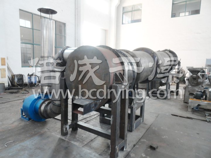 濕物料從干燥機一端投入后,在內筒均布的抄板器翻動(dòng)下,物料在干燥器內均勻分布與分散,并與并流(逆流)的熱空氣充分接觸,加快了干燥傳熱,傳至推動(dòng)力。在干燥過(guò)程中,物料在帶有傾斜度的抄板和熱氣流的作用下,可調控地運動(dòng)至干燥機另一段星形卸料閥排出成品。