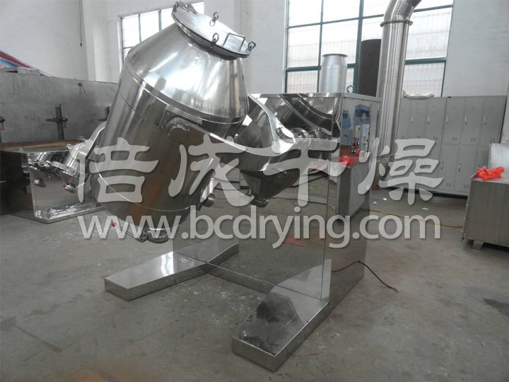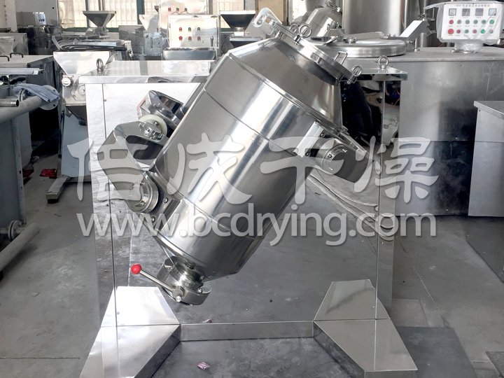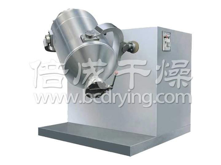 裝料的筒體在主動(dòng)軸的帶動(dòng)下,作周而復始的平移、轉動(dòng)和翻滾等復合運動(dòng),促使物料沿著(zhù)筒體作三向復臺運動(dòng),從而實(shí)現多種物料的互相流動(dòng)、擴散、積聚、摻雜.以達到均勻混合的目的。