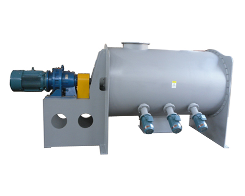 對需要固——液混合的物料,混合液體通過(guò)噴液裝置均勻噴灑在筒體內運動(dòng)的物料上。