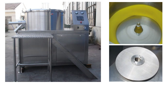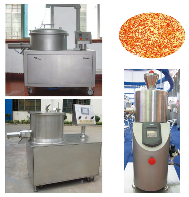 本機是通過(guò)設置旋轉離心盤(pán)、鼓風(fēng)機、氣動(dòng)噴槍?zhuān)瑢耦w粒制成美麗的球丸。將前道工序做成的濕顆粒投入旋轉離心盤(pán)內,啟動(dòng)鼓風(fēng)機后再將旋轉離心盤(pán)啟動(dòng),使濕顆粒受到環(huán)隙空氣浮力、旋轉離心力、自身重力作用,呈環(huán)周繩股狀運動(dòng),從而形成真球度極高的球丸。旋轉盤(pán)自動(dòng)升降,使物料的收集和制丸速度大大提高。